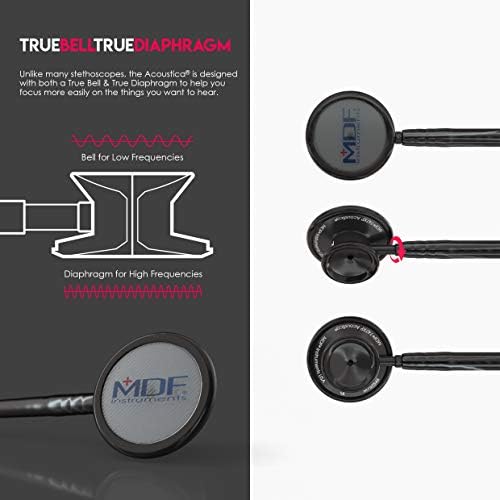 Handcrafted Since 1971 | Lifetime Warranty | Free-Parts-for-Life Program | Latex Free The MDF Acoustica Stethoscope is a lightweight diagnostic instrument that delivers accurate auscultation of heart, lung, and Korotkoff sounds with acoustic integrity and clarity. An ergonomic design ensures comfort for the doctor and patient, even during extended use. Precisely handcrafted from premium aluminum, the Acoustica Stethoscope is the ultimate in auditory diagnostics with unmatched performance and durability. The lightweight aluminum dual-head chestpiece is precisely machined and hand polished for the highest performance and durability. Full-rotation acoustic valve stem with green indicator dot allows the user to easily identify the active sound channel. The chestpiece is fitted with an ultrasensitive diaphragm sealed with a non-chill retaining ring to provide a secure acoustic transmission. The large bell, crowned with a non-chill bell ring, provides greater sound amplification, isolation of low frequencies, and patient comfort. Soft silicone ComfortSeal eartips are phthalate-free and clear for hygienic purposes. To ensure proper fit and isolation of sound. Hand polished, pre-angled chrome plated brass headset features a patented internal dual-leaf spring construction for durability. Patented SafetyLock eartip adaptors lead the industry in user safety. Constructed of thicker, denser, latex-free PVC, the Y-configuration non-stick acoustic tubing provides insulation for superior sound transmission and seals out ambient noise while preventing the cracking and wearing that can occur from repeated use. The longer-than-average length allows a comfortable space between health professional and patient. A patented internal metal-alloy chamber located in the acoustic tubing below the spring keeps the tubing channel open for maximum sound transmission into the headset. Extra set ComfortSeal eartips, spare ultrasensitive diaphragm, and ID tag.