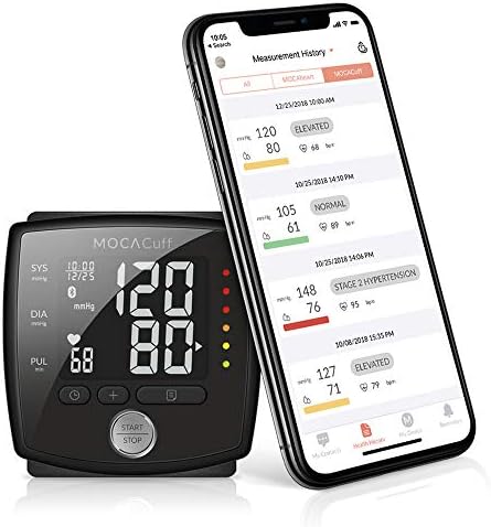The MOCACuff wrist blood pressure monitor instantly and accurately measures blood pressure and heart rate. It syncs wirelessly with the MOCACARE App to give you full access to your measurement history, graphs of your personal health trends, health coaching, and the ability to export & email results directly to your doctor.