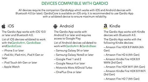 Product Description DEVICES COMPATIBLE WITH QARDIO All devices require the companion QardioApp which works with iOS and Android devices with Bluetooth 4.0 (or later). QardioCore is available on iOS only. It is recommended to use Qardio App with a validated device to ensure maximum reliability iOS The Qardio App works with iOS 10.0 or later and Bluetooth 4.0 List of iOS devices validated to work with theQardioArm, QardioBase andQardioCore – iPhone 5 or later – iPad Air, iPad mini, iPad 4 Gen or later – iPod Touch 6th Gen or later – Apple Watch Android The Qardio App works with Android 5 or later and requires access to Google Play List of Android devices validated to work withQardioArm &QardioBase – Samsung Galaxy S4 or later – Samsung Galaxy Note3 or later – Google Pixel 1 and 2 – Google Nexus 4 or later – Motorola Moto X/Droid Turbo – OnePlus One or later Kindle The Qardio App works with Kindle devices with Bluetooth 4.0 The Qardio App works with the following Kindle devices – Amazon Fire HDX 8.9 WAN (4th Gen) – Amazon Fire HD 6 (4th Gen) – Amazon Kindle Fire HDX 8.9 WAN (3rd Gen) – Amazon Fire HDX WiFi (4th Gen) – Amazon Kindle Fire HDX 8.9 WiFi (3rd Gen) – Amazon Fire HD 7 (4th Gen)