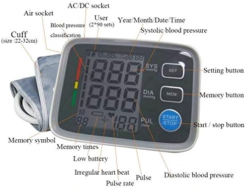 3.Large Digital Display; quickly and easily see systolic, diastolic, blood pressure classification, heart rate, and also tell if you have an irregular heartbeat. Displayed measurements include: systolic pressure, diastolic pressure, pulse rate, date, time, and user.